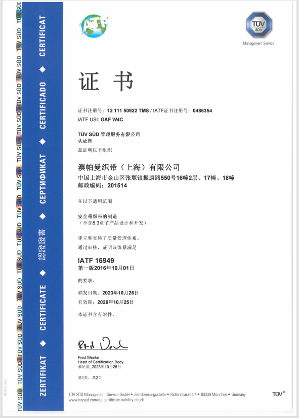 1848年,德国青年爱德华澳帕曼开始在他的家乡——德国北部的一个小乡村,用木制织机为当地的家具工业纺造织带。四十年后,他领会使用蒸汽能量的好处而维新工厂,使之现代化。业务自此光大兴隆。从澳帕曼生产的第一条织带出现至今已有170多年,爱德华的后代仍在纺造织带。但日前工厂的规模、生产工艺及设备已远非他当日所能想象。现在的澳帕曼公司在欧洲、亚洲及美洲都有生产厂及销售服务机构,每年的产能超过陆亿米。作为工业织带制造商,澳帕曼一贯启用各种技术纤维及织染设备,为民用工业、 军事工业、 航空、航天、 陆上及远洋运输生产各种常规及特殊性能的织带。产品系列主要有汽车安全带织带、汽车安全气囊系带、儿童座椅安全带织带、捆绑带、吊装带、牵引带、芳纶织带、高空作业安全带、轮椅织带、导电织带、军用织带、一次性平面防护口罩(成人和儿童),KN95防护口罩及FFP2防护口罩等。